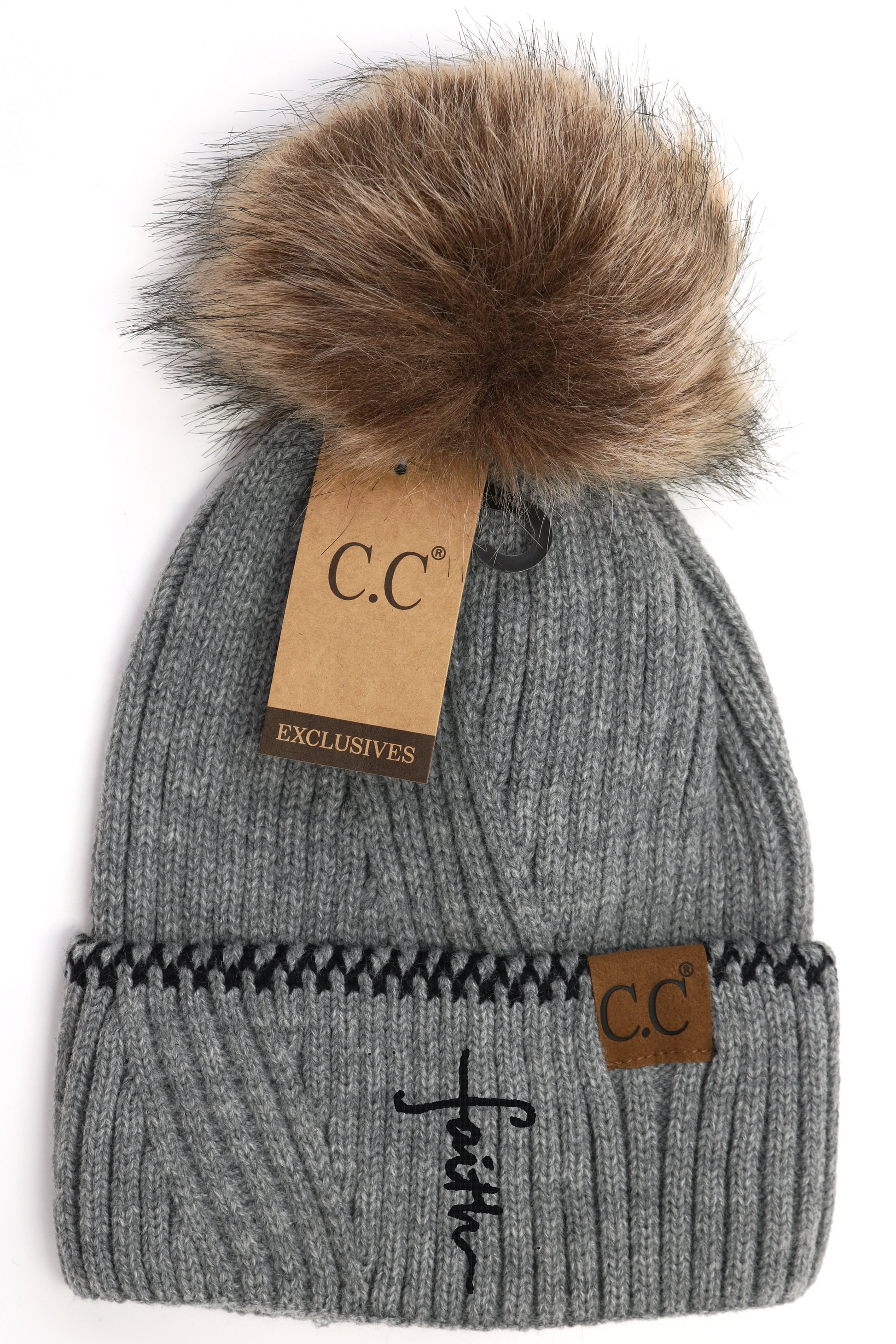 An overlapping ribbed knit with an accented cuff and a faux fur pom! This beanie is elegant and stylish!