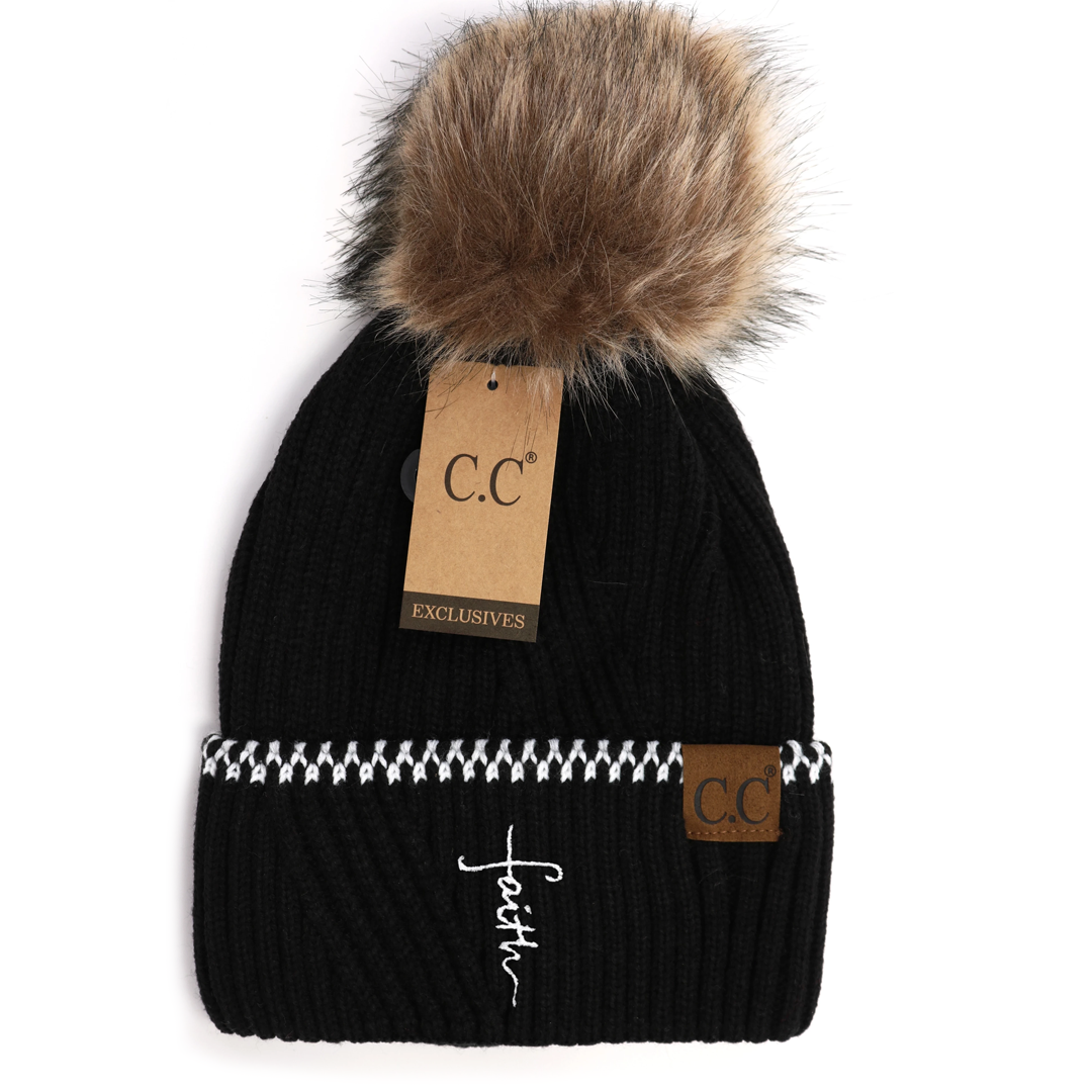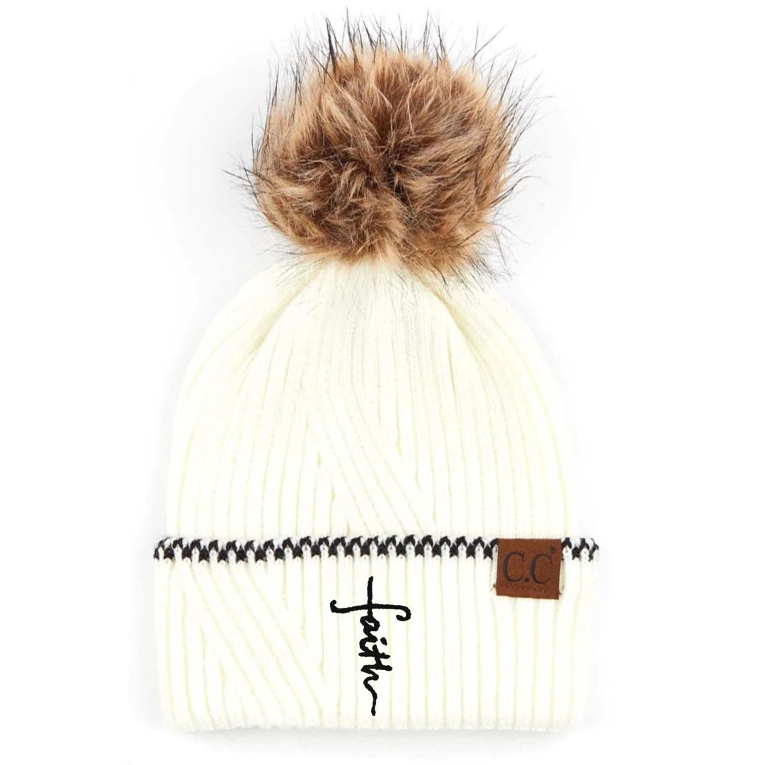 Faith Cross Ribbed Knit Beanie With Accented Cuff
