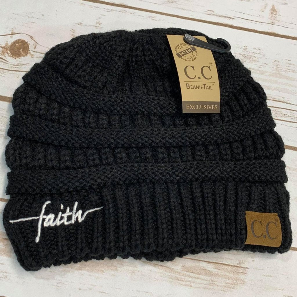 The much anticipated arrival of a "messy bun" CC beanie has not disappointed! This CC beanie tail beanie allows you to wear your favorite head gear on a cold day, but pull your hair off your ears and neck! It features an elastic opening in the middle to keep the beanie in place without slipping!