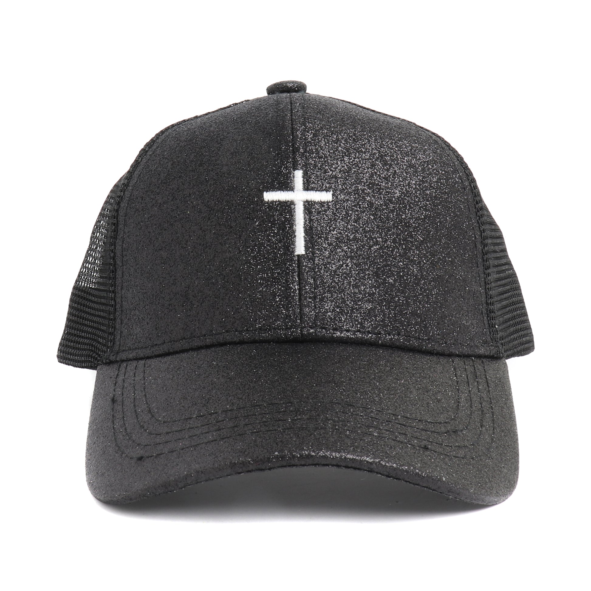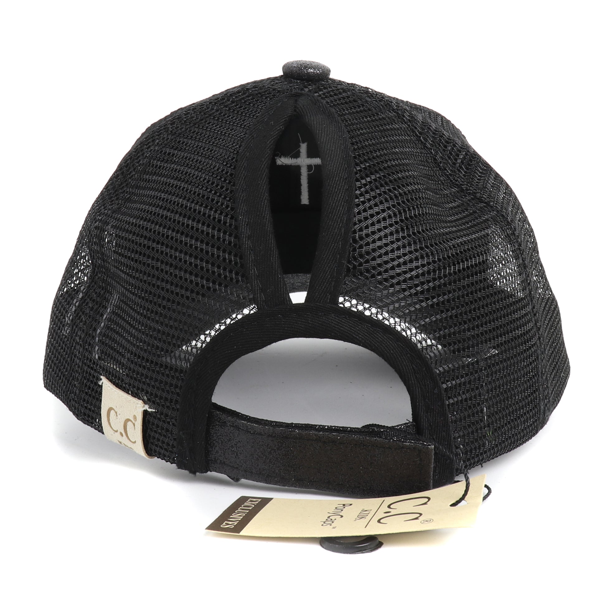 This cap features a rounded bill, a glitter front, a mesh back with a glitter Velcro adjustable back strap, and top opening for your high ponytail or messy bun.
